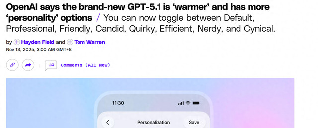 [环球网科技综合报道]11月13日消息,据TheVerge报道,OpenAI今日正式发布GPT-5.1系列旗舰模型,以“提升ChatGPT智能水平与对话趣味性”为核心目标的此次升级,将于本周启动用户推送,旧版GPT-5模型将在三个月后完成全面替代。
